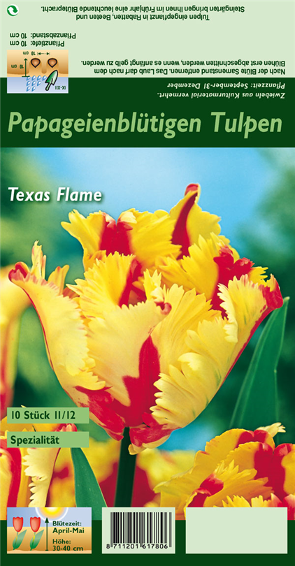 Die Papageien-Tulpe 'Texas Flame' (Tulipa) bringt von April bis Mai attraktive rot-gelb-grüne Blüten hervor. Die schlanke Staude bevorzugt einen durchlässigen, lockeren, nährstoffreichen Boden in sonniger Lage. Sie wächst aufrecht, erreicht gewöhnlich eine Höhe von 30 - 40 cm und wird bis zu 12 cm breit.