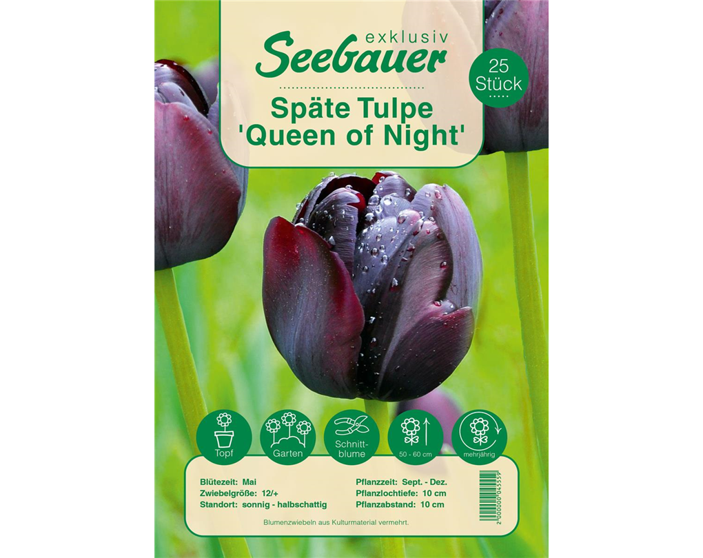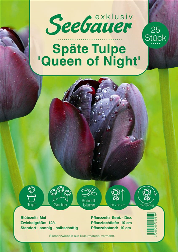 Die beeindruckenden schwarz-violetten Blüten der 'Queen of Night' erscheinen von April bis Mai und werden etwa 6 - 8 cm groß.