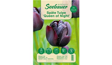 Die Späte Tulpe 'Queen of Night' (Tulipa) ist mit ihren schwarz-violetten Blüten eine besondere Augenweide. Sie blüht von April bis Mai und bevorzugt einen Standort in sonniger bis halbschattiger Lage.