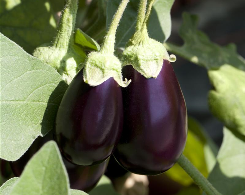 Die auch als Eierfrucht bezeichnete Aubergine 'Patio Baby' (Solanum melongena) bildet mild schmeckende Früchte, die bereits ab Juli geerntet werden können. Für das optimale Wachstum der Aubergine werden ein sonniger Standort und durchlässiger, nährstoffreicher Boden benötigt.