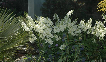 Die weißen Blüten erscheinen von Juli bis September.