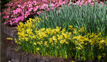 Narzissen benötigen den Frostimpuls, um zu blühen. Daher werden die Zwiebeln im Herbst mit einer Pflanztiefe von 10 cm und einem Pflanzabstand von 7 - 8 cm gesetzt.