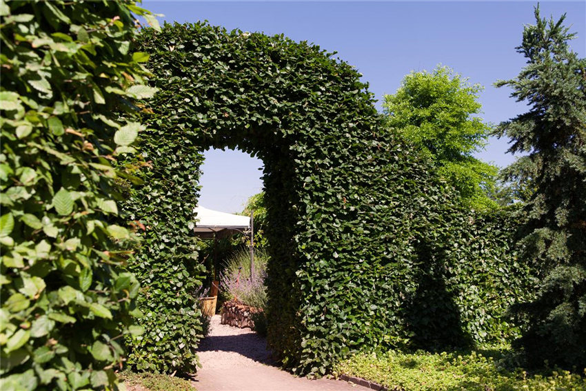 Je größer der Garten ausfällt, desto mehr Raum nehmen Wege ein. Grundsätzlich verleiht ein Rundweg, der an einem Punkt beginnt und wieder zu ihm zurückführt, dem Garten einen guten Zusammenhalt. Aber auch Wege, die zu einem Endpunkt führen, haben ihren eigenen Reiz. Etwa, wenn ein romantischer Sitzplatz zwischen idyllischen Wildrosen und duftendem Lavendel lockt oder wenn eine Skulptur zwischen verschieden großen Buchsbaumkugeln wartet. Der Endpunkt wird zum Überraschungseffekt, wenn man einen lebenden Raumteiler durchschreiten muss, um ihn zu erreichen. Das kann Thuja oder Kirschlorbeer, Glanzmispel oder Eibe und vieles andere an Heckenbildung sein. Ein schmiedeeisernes Tor oder ein Rosenbogen macht den Durchgang perfekt.